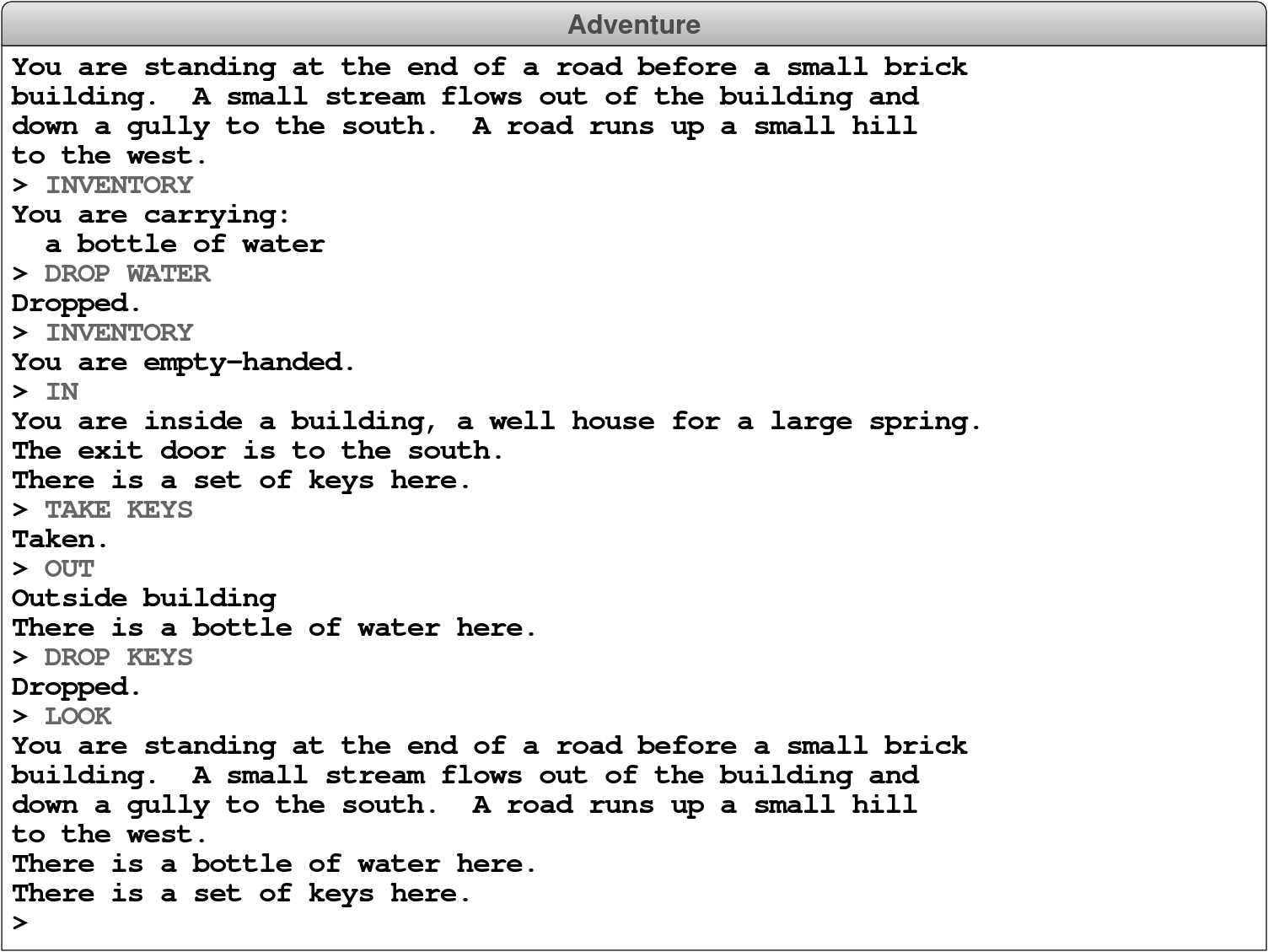 TAKE,DROP, andINVENTORYcommands. Note thatTAKEandDROPrequire you to read an item name that comes after the action verb. This is made easy using the token scanner, but you could handle it otherwise should you want.